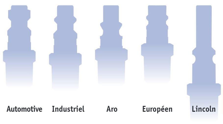 Les raccords universels s'ajustent aux connecteurs les plus courants, y compris des raccords AUTOMOTIVE, INDUSTRIEL, ARO, HIGH FLOW(CEJN) et LINCOLN. En cas de doute sur le type de raccord qui convient a votre application, ces raccords pourraient etre votre meilleur choix.Aussi voir la section sécuritaire, vous trouverez d'autre model universel